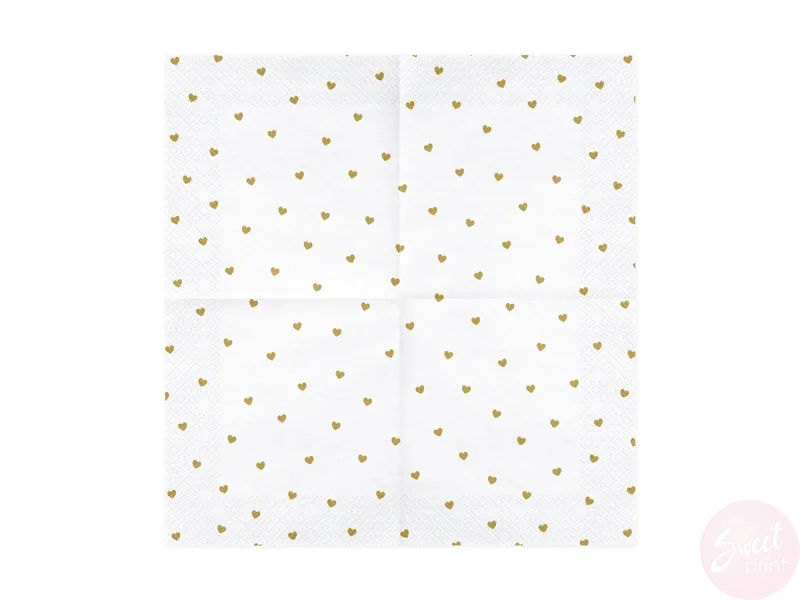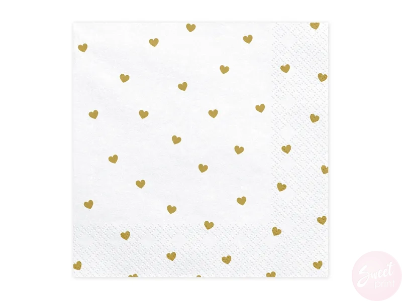 Białe, papierowe serwetki w złote serduszka będą ozdobą każdego imprezowego stołu czy bufetu.
