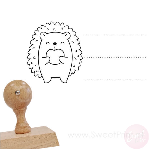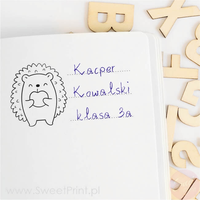 Taki stempel z jeżykiem posłuży nie tylko do oznaczania przyborów szkolnych, możesz używać go dowolnie np. jako ex libris czy etykietę na opakowania lub przetwory.
