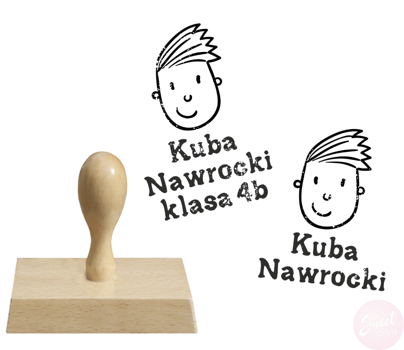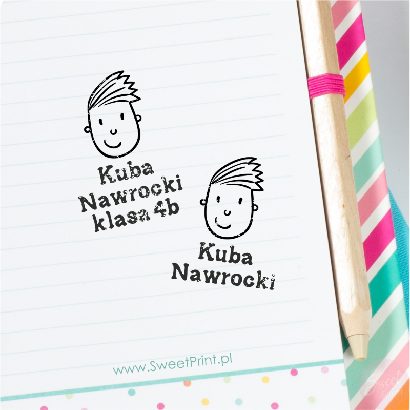 Personalizowana pieczątka z buźką chłopca i krótkim tekstem