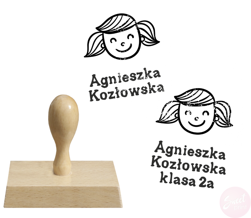 Personalizowana pieczątka z buźką dziewczynki i krótkim tekstem