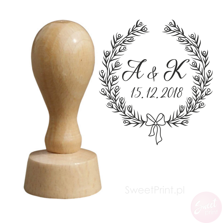 Drewniany stempel z wiankiem z gałązek i małą, ozdobną kokardką.