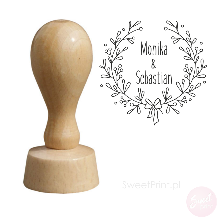 Drewniany stempel z wiankiem z gałązek i małą, ozdobną kokardką.