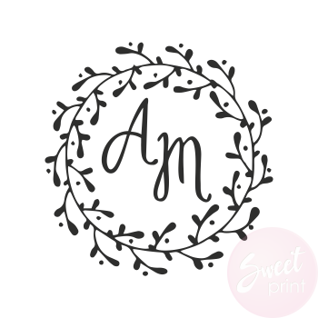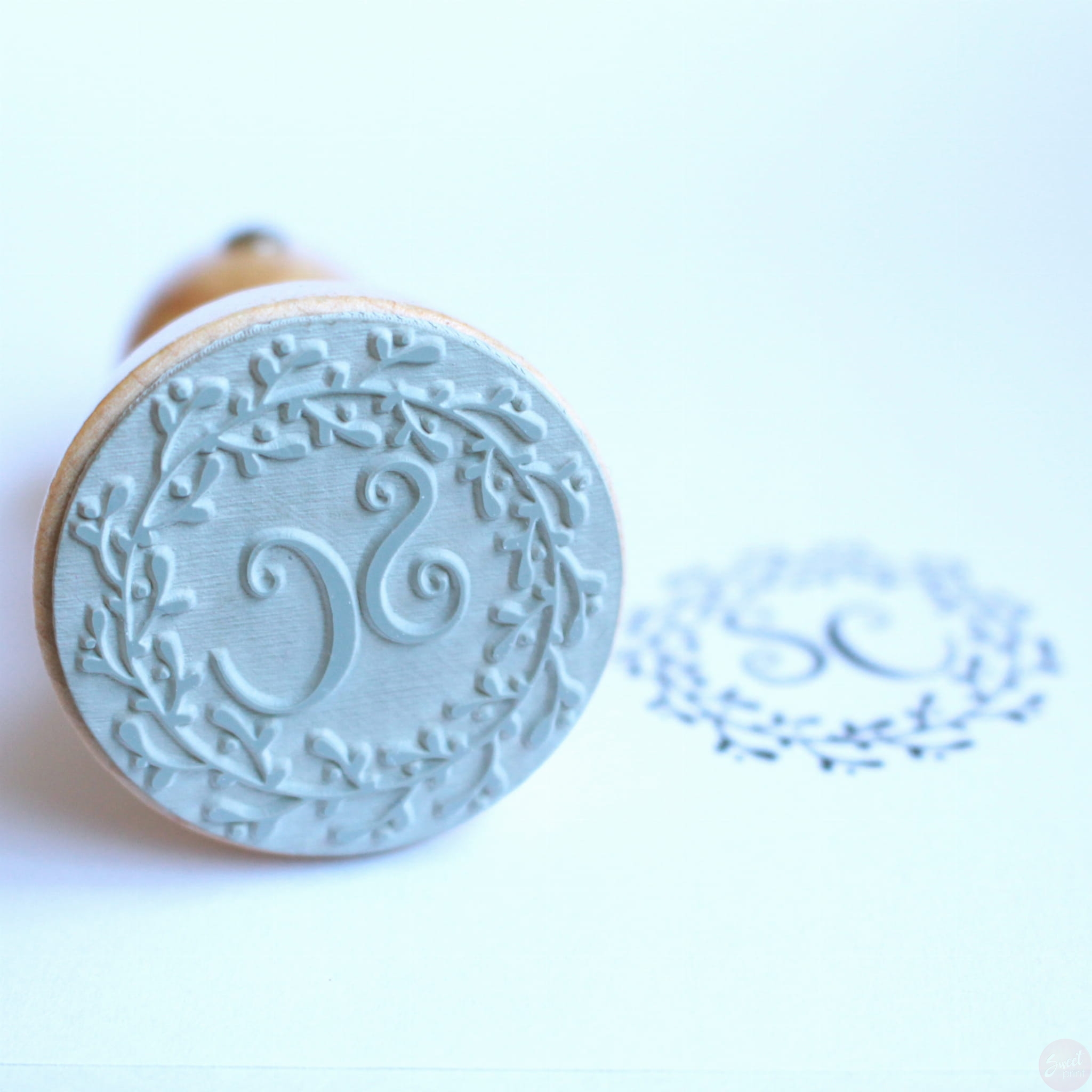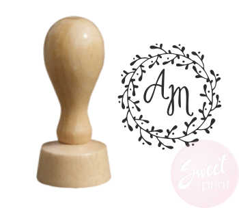 Drewniany stempel z liściastym wiankiem oraz miejscem na dodanie własnego tekstu lub inicjałów.