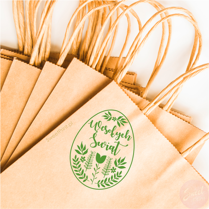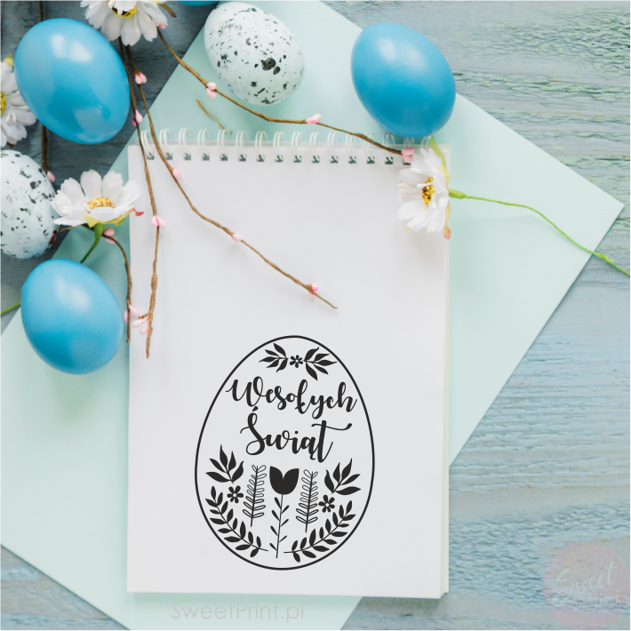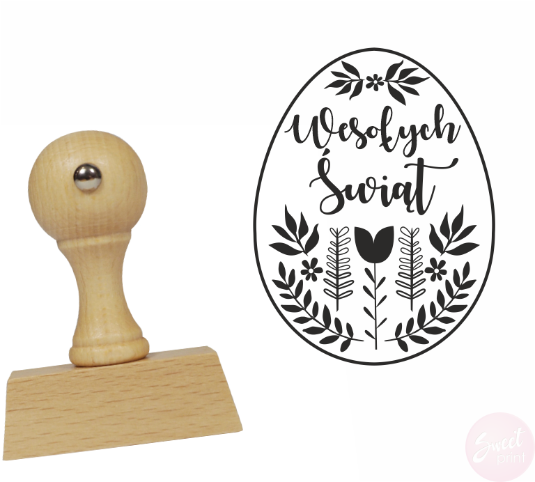 Stempel wielkanocny w kształcie jajka z napisem Wesołych Świąt.