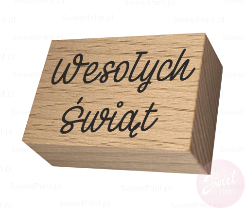 Drewniany stempel z napisem Wesołych Świąt.