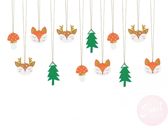 Opakowanie zawiera 12 zawieszek (4 wzory, po 3 szt. z każdego wzoru) i 2.5 m złotego sznurka
