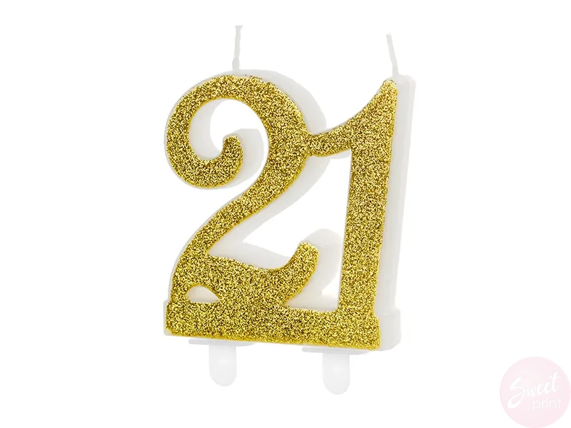 Świeczka urodzinowa w kształcie dwudziestki jedynki, złota brokatowa