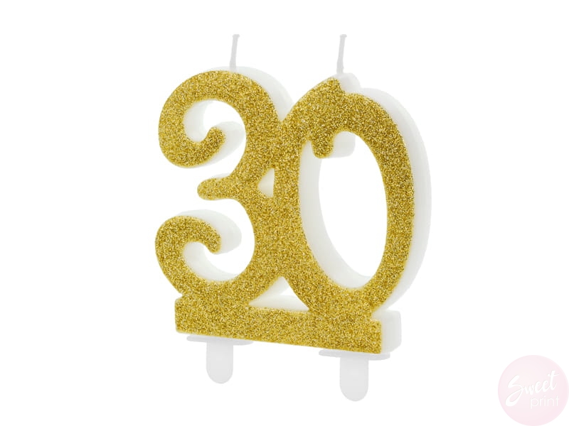 Świeczka urodzinowa w kształcie trzydziestki, złota brokatowa