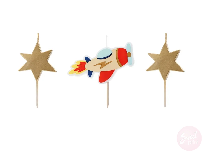 Na idealnych urodzinach nie może zabraknąć świeczek na torcie. Śliczną dekoracją będą te oryginalne świeczki w kształcie samolotu i gwiazdek.