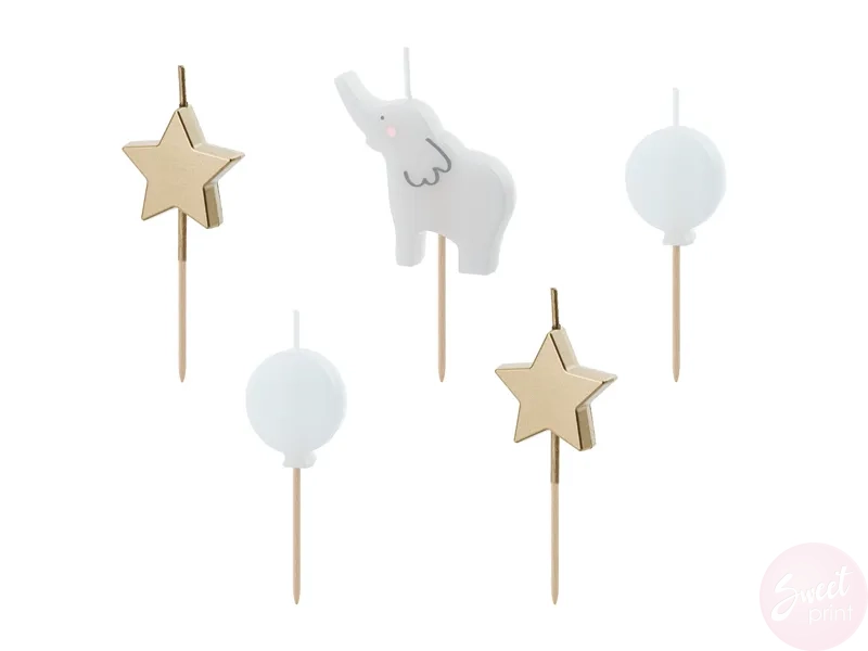 Na idealnych urodzinach nie może zabraknąć świeczek na torcie. Śliczną dekoracją będą te oryginalne świeczki w kształcie słonika, gwiazdek i baloników.