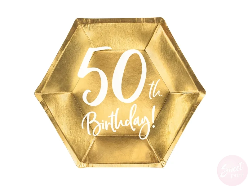 Papierowe talerzyki w złotym kolorze, z napisem 50th Birthday wspaniale ozdobią urodzinowy stół z przekąskami!