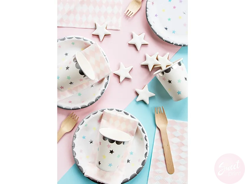 Papierowe talerzyki w pastelowe gwiazdki wspaniale ozdobią stół z przekąskami!