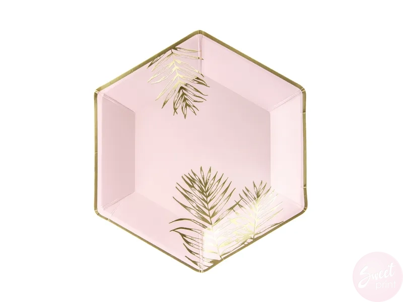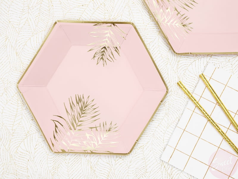 Papierowe, różowe talerzyki ze złotymi liśćmi