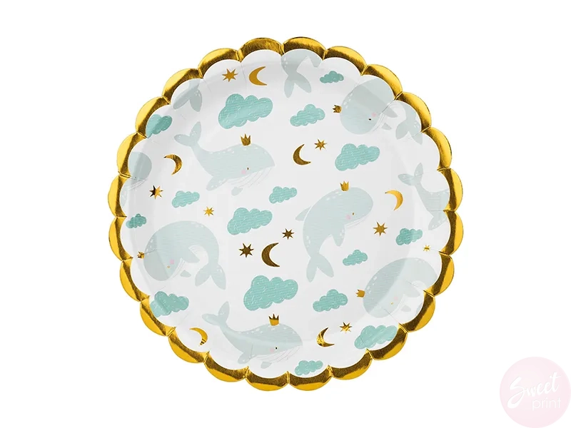 Papierowe talerzyki z wielorybami