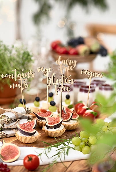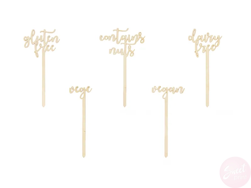 - zestaw zawiera 5 topperów z napiami: Vege, Vegan, Dairy free, Contains nuts i Gluten free