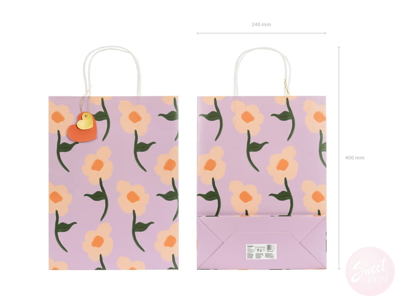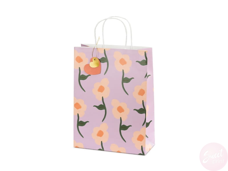 Taka papierowa torebeczka ze skręcanymi uchwytami będzie idealna do zapakowania słodkości, upominków urodzinowych lub produktów czy artykułów handmade. Torebka jest w kolorze niebieskim z nadrukiem w kwiatki. Torebka ozdobiona jest zawieszkami w kształcie serduszek.