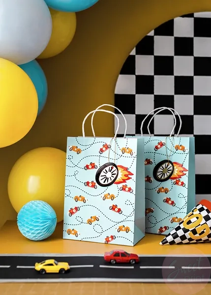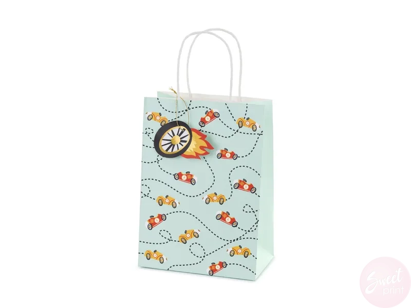 Taka papierowa torebeczka ze skręcanymi uchwytami będzie idealna do zapakowania słodkości i upominków, świetny dodatek na tematyczne urodziny z motywem samochodów wyścigowych.
