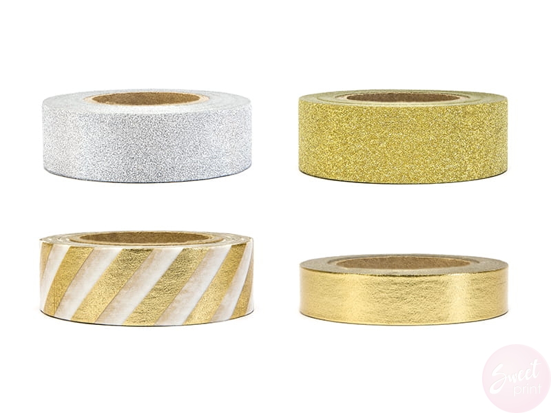 Zestaw zawiera 4 rolki po jednej z każdego koloru: srebrny brokatowy, złoty brokatowy, złoty metalizowany, paski metalizowane