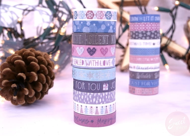 Zestaw 20 rolek dekoracyjnych taśm samoprzylepnych z motywami świątecznymi.