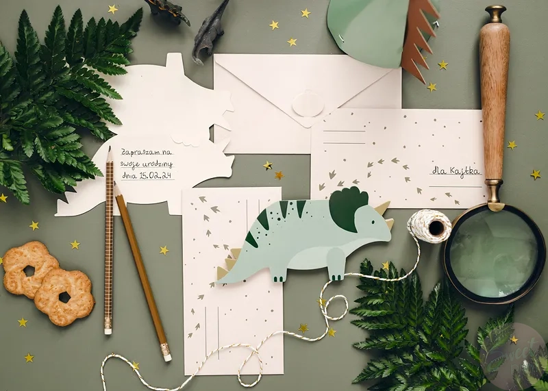 Zaproś rodzinę i przyjaciół na przyjęcie urodzinowe wręczając im kolorowe zaproszenia w kształcie dinozaura.