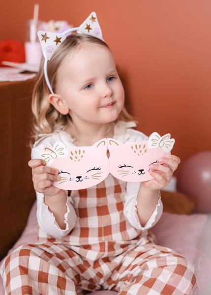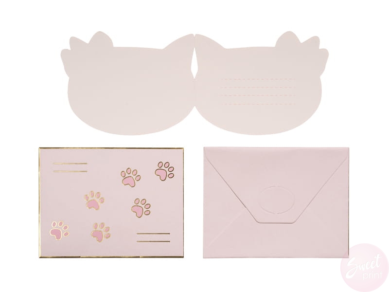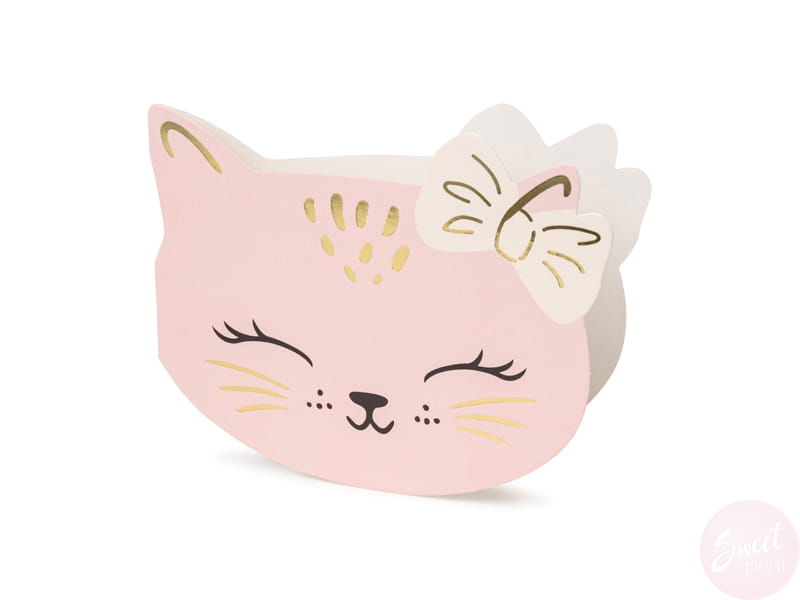 Zaproś rodzinę i przyjaciół na przyjęcie urodzinowe wręczając im kolorowe zaproszenia w kształcie kotka.
