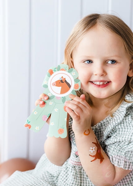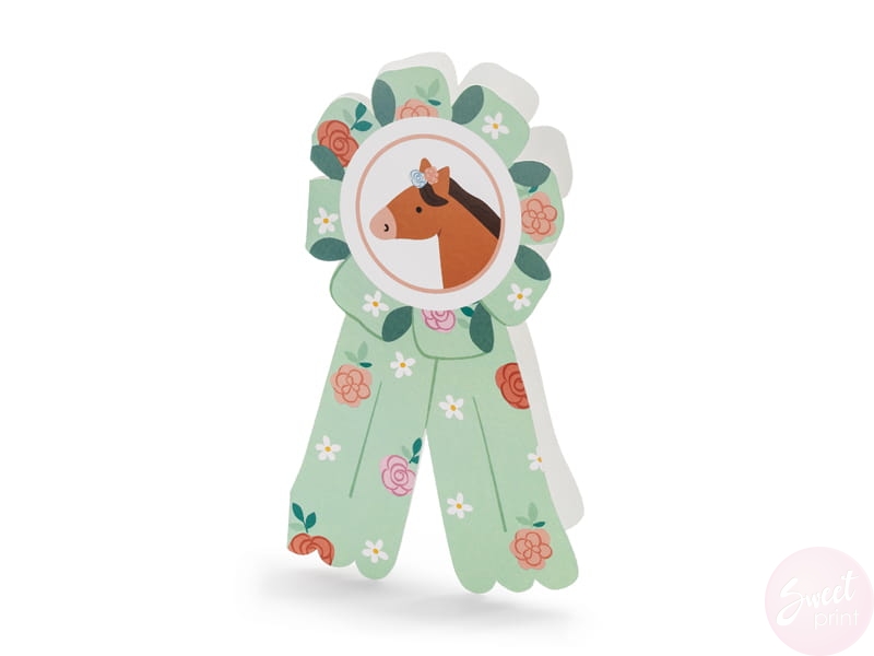 Zaproś rodzinę i przyjaciół na przyjęcie urodzinowe wręczając im kolorowe zaproszenia w kształcie kotylionu z konikiem.