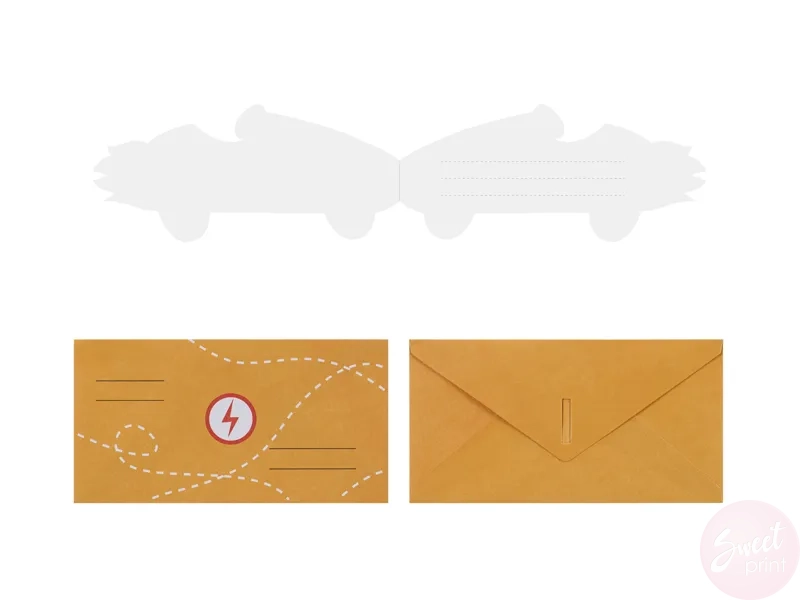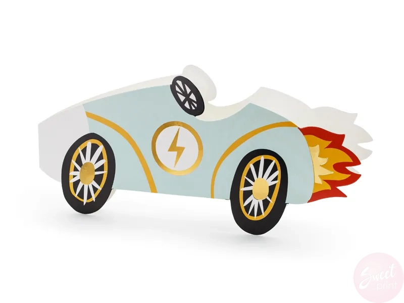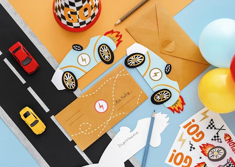Zaproś rodzinę i przyjaciół na przyjęcie urodzinowe wręczając im kolorowe zaproszenia w kształcie wyścigówki.